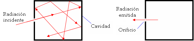 Aunque en realidad no existe un cuerpo negro real, podemos tomar como tal una cavidad con un pequeño orificio, cuyas paredes interiores estén pintadas de negro. Es un buen ejemplo, pues absorbe toda la radiación que incide en el agujero (Ver figura 1). Ahora bien, experimentalmente se comprueba que estos cuerpos negros también emiten una determinada radiación, cuya energía por unidad de superficie sólo depende de su temperatura. En definitiva, absorben toda la radiación que incide sobre ellos y la que emiten no es visible a temperaturas ordinarias, por eso se ven negros. Si a un bloque de metal negro se le aumenta la temperatura adquiere un color rojizo oscuro, que luego pasa a rojo vivo, e incluso blanco azulado. Es decir, conforme aumenta la temperatura, la longitud de onda máxima emitida va disminuyendo.