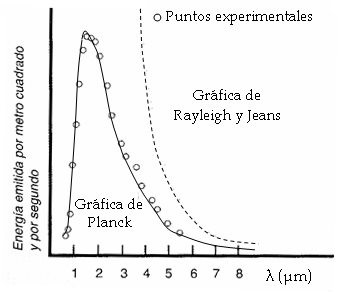 Cuando Rayleigh y Jeans intentaron justificar este hecho usando los conceptos de la física clásica (principios del electromagnetismo y mecánica estadística), hallaron que el tipo de gráfica que tendría que cumplir la energía en función de λ sólo se ajusta a la experimental en los valores más altos (línea de puntos) de λ.