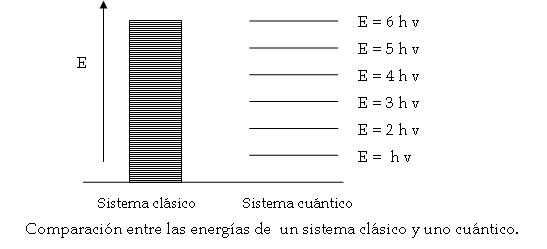 Así pues, la energía total E emitida o absorbida por una sustancia será un múltiplo de dicha unidad fundamental Eo: E = n h f (n = 1, 2, 3…). Esto también implica que la energía no puede adoptar cualquier valor, sino que está limitada a los múltiplos de dicha unidad fundamental o cuanto. Decimos que la energía está cuantizada. Este es un concepto opuesto al de la mecánica clásica, donde la energía puede tomar un conjunto continuo de valores.