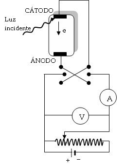 Para la medida experimental de las energías de los fotoelectrones se utiliza el diseño mostrado en la figura 6. Los electrones arrancados al iluminar el cátodo originan una corriente eléctrica de intensidad I al chocar contra el ánodo, que se puede medir con el amperímetro A haciéndola pasar por el circuito inferior. La intensidad es proporcional al número de electrones arrancados.